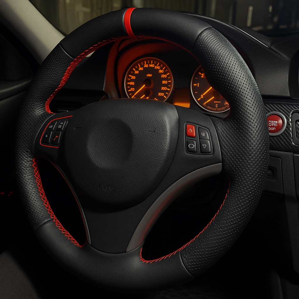 Performance Lenkradbezug - Leder glatt / perforiert + 12 Uhr Markierung rot - passend für BMW E90 E91 E92 E93 E81 E82 E87 E88