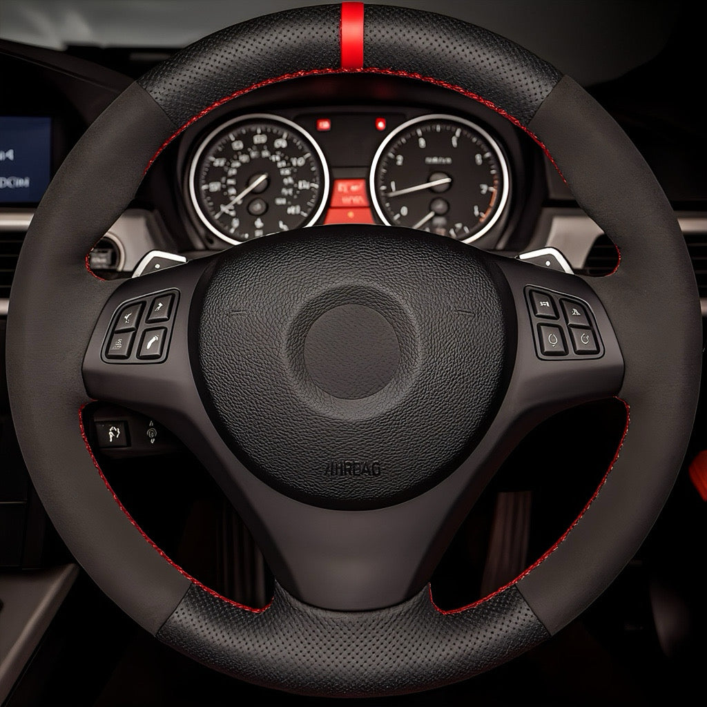 Performance Lenkradbezug - Perforiertes Leder mit Alcantara + 12 Uhr Markierung rot - passend für BMW E90 E91 E92 E93 E81 E82 E87 E88