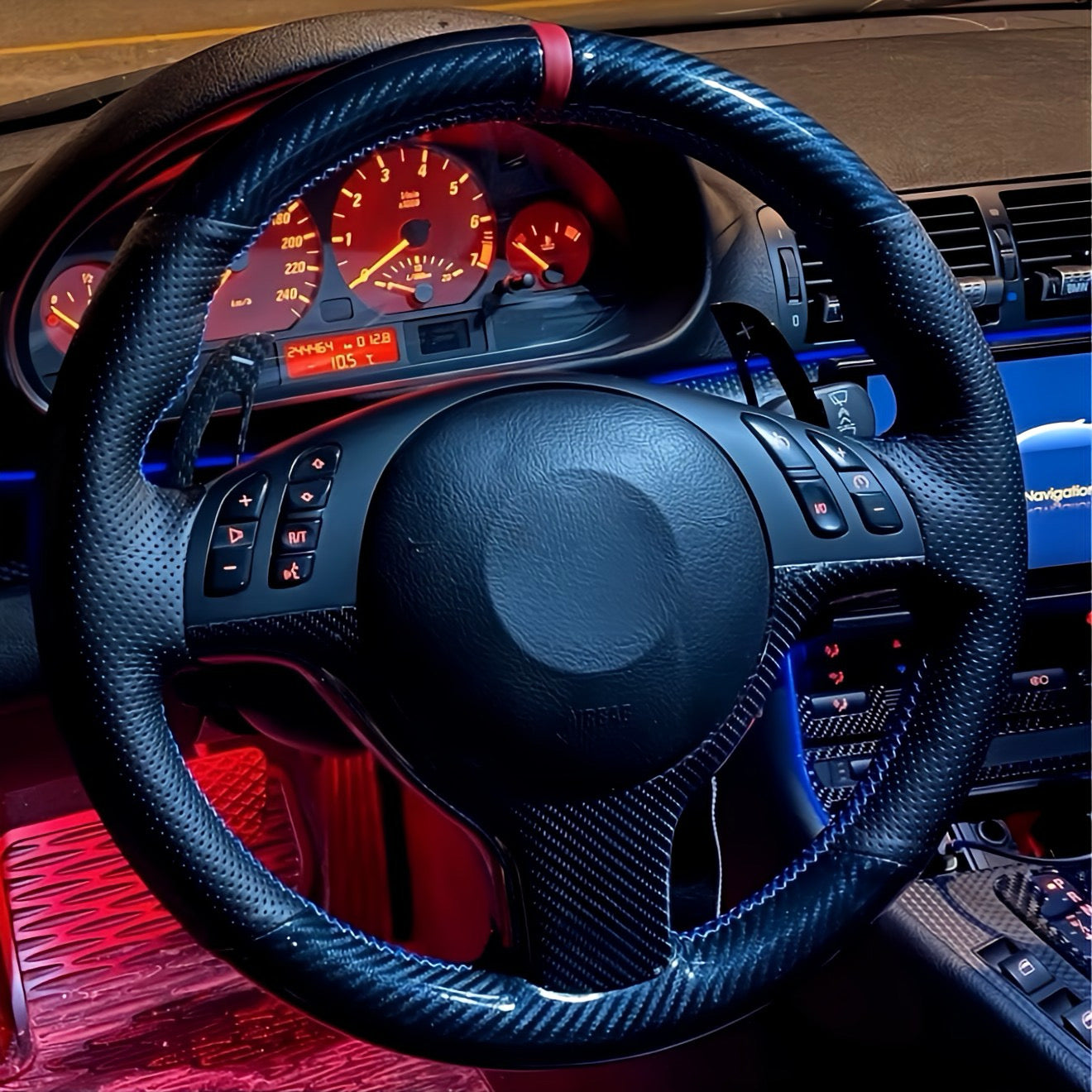 Performance Lenkradbezug - Leder / Carbon + 12 Uhr Markierung rot - passend für BMW E46 E39